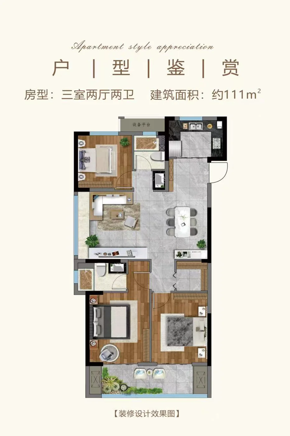 约111㎡户型,两卧室朝南,客餐厅一体化空间,边厅还有观景飘窗,保证采光良好。