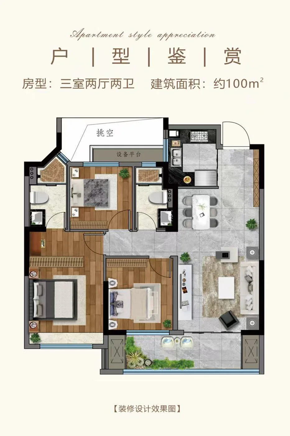 请点击此处输入图片描述约100㎡户型,三房+两卫的设计,从容应对新婚家庭转变到三代同堂时产生的居住需求。LDKG一体化,打破传统户型的边界感,让空间使用率更高。