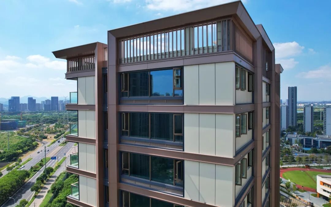 整体建筑符合新时代审美潮流,以大面积香槟金铝板为基调,铺垫沉稳大气的硬朗格调,辨识度极高。
