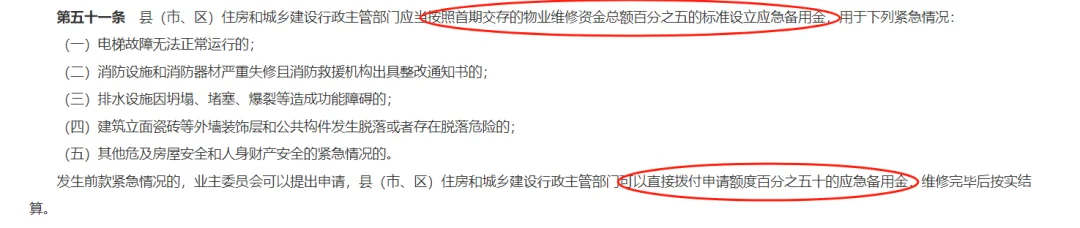 第五十一条提到,应当按照首期交存的物业维修资金总额百分之五的标准设立应急备用金,发生前款紧急情况的,可以拨付申请额度百分之五十的应急备用金。