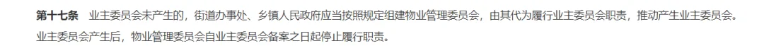 第十七条提到,业主委员会未产生的,街道办事处、乡镇人民政府应当按照规定组建物业管理委员会,由其代为履行业主委员会职责,推动产生业主委员会。