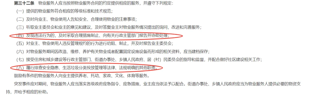第三十二条提到了,发现违法行为的,及时采取合理措施制止、向有关行政主管部门报告并协助处理;履行排查安全隐患、生活垃圾分类投放管理等法律、法规明确的其他职责。