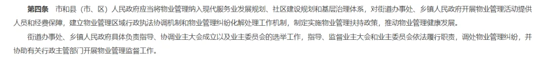 第四条还提到,政府应当将物业管理纳入现代服务业发展规划,建立物业管理区域行政执法协调机制和物业管理纠纷化解处理工作机制。