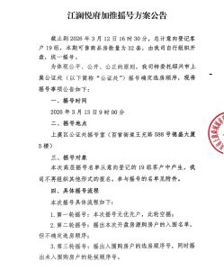 1. 截至2026年3月12日16时30分,共有19组意向登记客户,本期可售商品房32套。 2. 开盘由我司自行组织,采用统一摇号方式。 3. 为确保公平、公开、公正,摇号委托绍兴市上虞公证处进行。 4. 摇号将确定选房顺序,具体事项详见公告。
