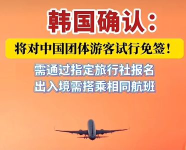 【韩国政府确认:将从9月29日起对中国团体游客试行免签】9月8日电,据参考消息网援引韩联社9月7日报道,韩国政府将从9月29日起面向中国团体游客(3人及以上)试行免签入境政策,停留期限为15天。