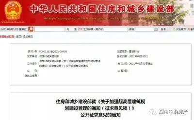 据住建部9月10日消息,住建部发布《关于加强超高层建筑规划建设管理的通知(征求意见稿)》,向社会公开征求意见。各地要严格控制新建超高层建筑,一般不得新建超高层住宅。 《通知》称,近年来,一些城市攀比建设超高层建筑,盲目追求高度、形式奇特,脱离实际需求,抬高成本投入,加剧能源消耗,加大安全管理难度。 《通知》提出,从严控制建筑高度,各地要严格控制新建超高层建筑,一般不得新建超高层住宅。 城区常住人口300万人口以下城市严格限制新建150米以上超高层建筑,不得新建250米以上超高层建筑。 城区常住人口300万以上城市严格限制新建250米以上超高层建筑,不得新建500米以上超高层建筑。 根据意见稿的相关要求: 各地相关部门审批80米以上住宅建筑、100米以上公共建筑建设项目时,应送当地消防救援机构征求意见,以确保当地消防救援能力相匹配。 城区常住人口300万以下城市确需新建150米以上超高层建筑的,应报省级住房和城乡建设部门审查,并报住房和城乡建设部备案。 城区常住人口300万以上城市确需新建250米以上超高层建筑的,省级住房和城乡建设主管部门应结合抗震、消防等专题严格论证审查,并报住房和